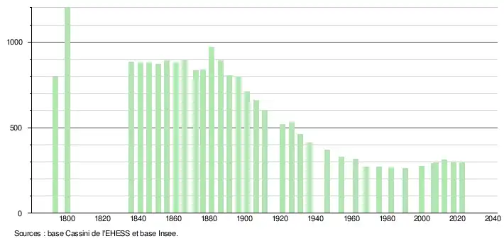 | L'évolution du nombre d'habitants est connue à travers les recensements de la population effectués dans la commune depuis 1793. Pour les communes de moins de 10 000 habitants, une enquête de recensement portant sur toute la population est réalisée tous les cinq ans, les populations de référence des années intermédiaires étant quant à elles estimées par interpolation ou extrapolation[29]. Pour la commune, le premier recensement exhaustif entrant dans le cadre du nouveau dispositif a été réalisé en 2007[30]. En 2022, la commune comptait 298 habitants[Note 3], en évolution de −1,32 % par rapport à 2016 (Lot : +1,31 %, France hors Mayotte : +2,11 %). |