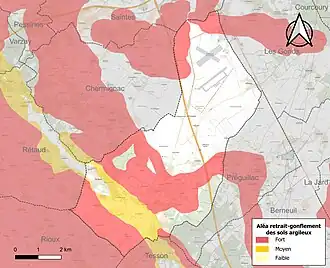 Le retrait-gonflement des sols argileux est susceptible d'engendrer des dommages importants aux bâtiments en cas d’alternance de périodes de sécheresse et de pluie. 46,8 % de la superficie communale est en aléa moyen ou fort (54,2 % au niveau départemental et 48,5 % au niveau national). Sur les 756 bâtiments dénombrés sur la commune en 2019, 569 sont en aléa moyen ou fort, soit 75 %, à comparer aux 57 % au niveau départemental et 54 % au niveau national. Une cartographie de l'exposition du territoire national au retrait gonflement des sols argileux est disponible sur le site du BRGM[13],[Carte 2].