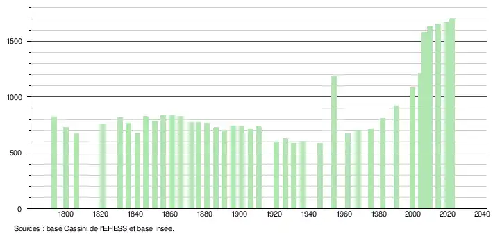 L'évolution du nombre d'habitants est connue à travers les recensements de la population effectués dans la commune depuis 1793. Pour les communes de moins de 10 000 habitants, une enquête de recensement portant sur toute la population est réalisée tous les cinq ans, les populations de référence des années intermédiaires étant quant à elles estimées par interpolation ou extrapolation[16]. Pour la commune, le premier recensement exhaustif entrant dans le cadre du nouveau dispositif a été réalisé en 2004[17].