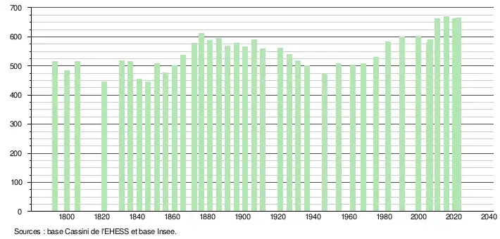 L'évolution du nombre d'habitants est connue à travers les recensements de la population effectués dans la commune depuis 1793. Pour les communes de moins de 10 000 habitants, une enquête de recensement portant sur toute la population est réalisée tous les cinq ans, les populations de référence des années intermédiaires étant quant à elles estimées par interpolation ou extrapolation[28]. Pour la commune, le premier recensement exhaustif entrant dans le cadre du nouveau dispositif a été réalisé en 2005[29].