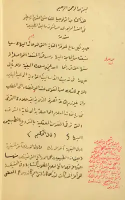 « Au nom de Dieu clément et miséricordieux, louange à Dieu, Seigneur des univers, et bénis soient Mahomet et sa famille. Premier chapitre du livre d’Aristote, le philosophe, appelé en grec Théologie, c’est-à-dire le discours sur la souveraineté divine. Commentaire de Porphyre, le Tyrien. Traduit en arabe par ‛Abd al-Masīḥ b. ‛Abd Allāh b. Nā‛ima d’Émèse. Corrigé à l’intention d’Aḥmad b. al-Mu‛taṣim bi-l-lāh par Abū Yūsuf Ya‛qūb b. Isḥāq al-Kindī, que Dieu le prenne en sa miséricorde[5]. »