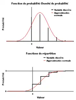 Avec une somme de variables discrètes, il est parfois commode de définir une pseudo-densité de probabilité mais l'outil le plus efficace est la fonction de probabilité représentée par un diagramme en bâtons. On peut constater graphiquement une certaine cohérence entre les deux diagrammes, difficile à interpréter. Dans ce cas, il est plus efficace de comparer les fonctions de répartition.
