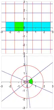 n'est jamais nul. L'application est en conséquence localement inversible en chaque point. À la différence des fonctions différentiables et définies sur un intervalle de R, cette propriété n'implique pas le caractère globalement injectif de f. Ajouter 2π à la deuxième coordonnée ne modifie pas l'image par f, ainsi chaque point de R2 possède une infinité d'antécédents, à l'exception de l'origine qui n'en a pas. Cette fonction peut être vue comme l'exponentielle complexe. Sa réciproque, le logarithme complexe, ne peut être définie continûment sur C* tout entier.