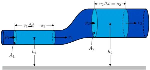 Si un liquide s'écoule dans une canalisation, alors comme il est incompressible, son débit (volume transitant à travers une surface par unité de temps) est constant. Si la canalisation s'élargit, alors la vitesse diminue (puisque le débit est le produit de la vitesse par la section, les deux varient à l'inverse). Le théorème de Bernoulli nous indique alors que la pression augmente. À l'inverse, si la canalisation se rétrécit, le fluide accélère et sa pression diminue. On qualifie ce dispositif expérimental de tube de Venturi.