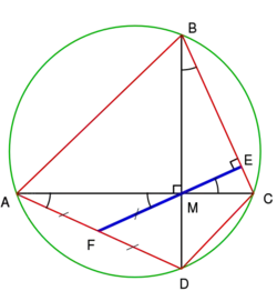 On suppose que ABCD est un quadrilatère inscriptible qui a ses diagonales perpendiculaires, et on veut prouver que AF = FD. La preuve qui suit établit que AF et FD sont toutes les deux égales à FM.