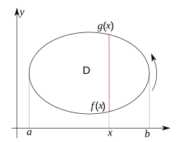 {\displaystyle D=\{(x,y)\in \mathbb {R} ^{2}\ ;\ a\leqslant x\leqslant b\ {\text{ et }}\ f(x)\leqslant y\leqslant g(x)\}}