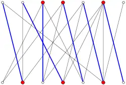 Exemple d'un graphe biparti avec un couplage maximum (en bleu) et une couverture de sommets minimale (en rouge), tous les deux de taille 6.