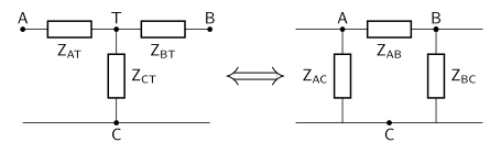 On parle ici d'une équivalence d'un circuit en T avec un circuit en π. Dans la pratique, on utilise davantage la transformation qui consiste à passer d'un circuit en π à un circuit en T.