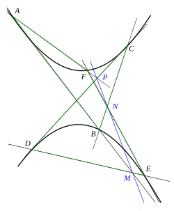 - les points d'intersection des trois paires de côtés opposés sont alignés (la droite joignant ces points est parfois appelée droite de Pascal).