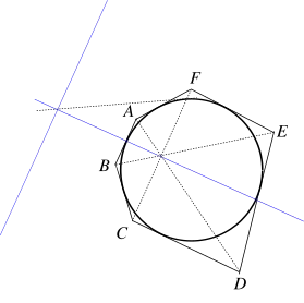 Théorème de Brianchon — Étant donné un hexagone circonscrit à un cercle, les diagonales sont concourantes.