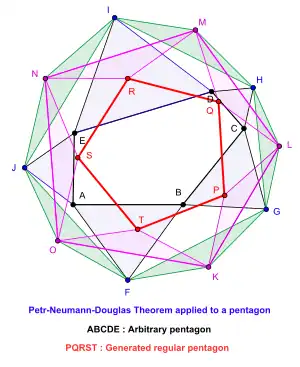 En géométrie, le théorème de Petr-Douglas-Neumann est un résultat concernant les polygones plans quelconques. Le théorème affirme qu'un certain algorithme appliqué à un polygone arbitraire produit toujours un polygone régulier ayant le même nombre de côtés que le polygone initial. Le théorème a été publié pour la première fois par le Tchèque Karel Petr de Prague en 1905 (en tchèque)[1] et en 1908 (en allemand)[2],[3]. Il a été redécouvert indépendamment par l'Américain Jesse Douglas en 1940[4] et également par le Britannique Bernhard Neumann (1909–2002) en 1941[3],[5]. Le nom du théorème de Petr-Douglas-Neumann est dû à Stephen B Gray[3]. On le désigne également sous les noms de théorème de Douglas, théorème de Douglas-Neumann, théorème de Napoléon-Douglas-Neumann et théorème de Petr[3].