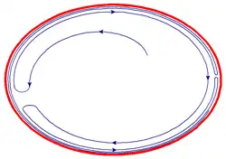 Supposons maintenant que la trajectoire ne se « croise » jamais. On peut supposer qu'à partir d'un certain temps, la trajectoire est toujours parcourue dans le même sens de rotation, à l'image de la figure de gauche. Supposons de plus qu'elle « s'enroule » sur l'extérieur et chaque presque tour elle est un peu plus proche de la frontière en rouge. La trajectoire est de plus en plus coincée entre la frontière rouge et la « boucle » précédente. L'intuition indique qu'elle finit par converger vers un lacet simple, c'est-à-dire boucle sans point double. Plus la solution s voit sa trajectoire se rapprocher de cette boucle, plus sa vitesse est proche de celle qu'elle aurait si la trajectoire était exactement sur la boucle, car le courant (autrement dit la fonction f définissant l'équation) est continu. Le cycle limite est donc un peu intuitif dans ce cas là. Le même raisonnement s'applique si la solution s'enroule sur l'intérieur et non plus à l'extérieur.