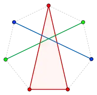 Dans le cas r = 3 et n = 2, le théorème stipule que sept points quelconques du plan peuvent être divisés en trois sous-ensembles dont les enveloppes convexes se coupent. L'illustration montre un exemple dans lequel les sept points sont les sommets d'un heptagone régulier. Comme le montre l'exemple, il peut y avoir de nombreuses partitions de Tverberg différentes du même ensemble de points ; ces sept points peuvent être partitionnés de sept façons différentes qui diffèrent par des rotations les unes des autres.