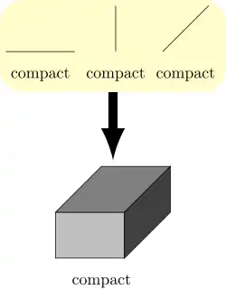 L'image montre trois segments compacts. Le théorème dit que le produit, i.e. le parallélépipède plein est toujours compact. L'image montre un cas fini ; le théorème reste vrai si on fait un produit cartésien d'un ensemble infini de compacts.