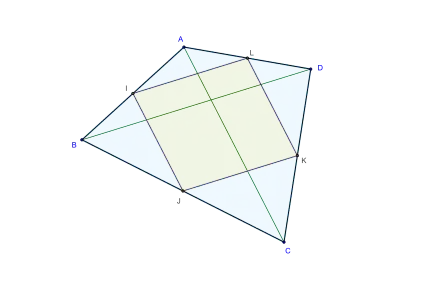 Théorème — Si ABCD est un quadrilatère quelconque et I, J, K, L les milieux de ses côtés, alors IJKL est un parallélogramme, appelé parallélogramme de Varignon du quadrilatère[1].