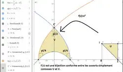 Comme les fonctions holomorphes "conservent les angles"[3], cela revient à dire, d'un point de vue géométrique, qu'il existe une bijection conforme entre et . La composée de deux fonctions holomorphes étant holomorphe, on voit qu'en fait, plus généralement, il existe une bijection conforme entre deux ouverts quelconques et satisfaisant les hypothèses précédentes.