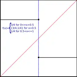 - Seconde étape. On se concentre sur une valeur d'adhérence (a, b, p, q) de cette suite de quadruplets (ai, bi, pi, qi) (il en existe, d'après le sens direct du théorème de Bolzano-Weierstrass, appliqué au compact [0, 1]4). Par construction, on a q ≤ b = a ≤ p. De plus (comme le graphe de φ est fermé), p ∈ φ(a) et q ∈ φ(b). En notant x l'élément a = b on peut résumer ainsi la situation :