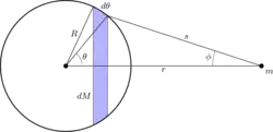 Soit le cône d'angle solide dΩ de sommet M ; l'axe du cône coupe la sphère en deux points P1 et P2 dont les distances à M sont r1 et r2. En ces points passent deux plans tangents à la sphère ; ils forment le même angle avec l'axe du cône (Θ1=Θ2). On peut s'en rendre compte par de simples considérations géométriques. Ainsi les masses δm1 et δm2 délimitées par dΩ à une distance r1 (resp. r2) du sommet M sont proportionnelles au carré de leur distance soit,