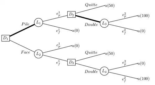 Arbre de décision représentant un problème de décision séquentielle dans l'incertain. La stratégie {(D1, L1), (D2, L3)} est représentée en gras.