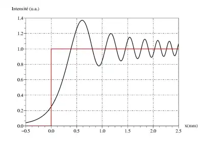 où . Cette intégrale est appelée transformation de Fresnel et permet de déterminer la figure de diffraction observée à distance finie de l'ouverture diffractante. Ce genre de diffraction peut par exemple s'observer sur les bords de l'ombre géométrique d'un écran, comme illustré ci-dessous.