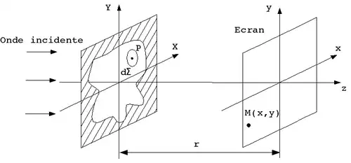 On considère une ouverture contenue dans le plan . Soit l'amplitude de l'onde incidente en un point P quelconque de l'ouverture, de coordonnées . L'amplitude de l'onde émise par la source secondaire de surface autour de est de la forme où est une constante qu'il n'est pas utile de chercher à déterminer ici.