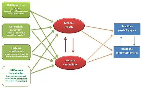 En 2000, Stephan et Stephan proposent une première version de la théorie de la menace intégrée. Ils postulent l'idée que la perception de menace favorise l'apparition de préjugés ainsi que la dégradation des relations et du contact intergroupe. La théorie propose quatre différents types de menace susceptibles d’être perçus et ressentis par les membres d'un groupe à propos d'autres groupes. Ce sont la menace réaliste, la menace symbolique, l’anxiété intergroupe et les stéréotypes négatifs[6]. Les menaces perçues sont souvent irréalistes ou exagérées[7].