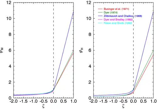 Plusieurs fonctions ont été proposées pour représenter les fonctions universelles de la théorie de la similitude. Puisque la longueur d'Obukhov est déterminée lorsque , la condition suivante doit être satisfaite par la fonction universelle choisie[1] :