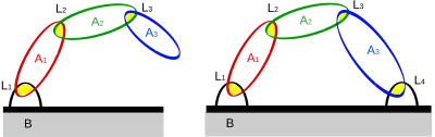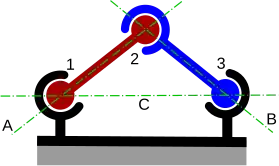- un mécanisme complexe comporte un ensemble de pièces liées de façon plus compliquée que dans les cas précédents. Schématiquement, en considérant l'ensemble carter + vilebrequin à 5 paliers + bielles + pistons d'un moteur à 4 cylindres, on trouve par exemple p = 9 pièces et a = 13 liaisons simples ou composées.