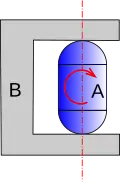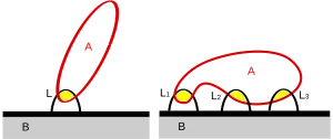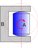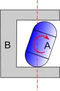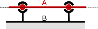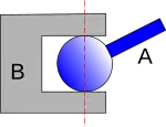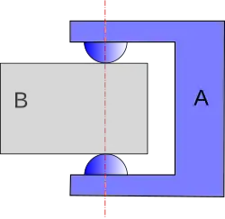 Lorsque les deux surfaces bombées n'appartiennent pas à la même sphère, l'hyperstaticité se manifeste immédiatement. Si le dispositif a l'allure schématisée ci-dessous, la distance des plans est supérieure au diamètre des sphères et la fonction est remplie tant que les éléments restent dans une position telle que les deux contacts ont la même normale. En revanche, si la pièce A bascule, le contact ne peut plus être maintenu des deux côtés du bâti en même temps. Le contact se produit d'un côté ou de l'autre et la liaison prend du jeu.
