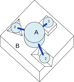 La sphère 3 repose dans un trièdre creux, ce qui impose la position de son centre par rapport au bâti mais autorise encore les trois rotations de A par rapport au bâti. En appuyant la sphère 2 dans un « vé », on fixe un second point, de sorte que A ne peut plus tourner qu'autour de l'axe passant par les centres des deux sphères. L'appui de la sphère 1 sur un plan achève l'immobilisation.