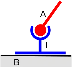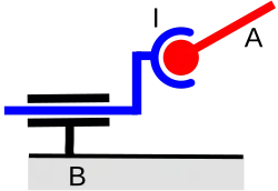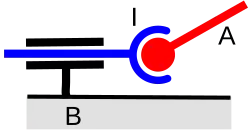 L'appui ponctuel d'une pièce A sur un bâti B engendre toujours des pressions de contact très élevées et on ne peut donc pas l'utiliser pour transmettre des efforts importants, surtout dans le cas où un glissement peut avoir lieu. L'idée de le remplacer par un mécanisme un peu plus complexe, remplissant exactement la même fonction, mais ne mettant en jeu que des liaisons surfaciques, aboutit à diverses solutions que l'on peut trouver en utilisant à bon escient la formule générale h = Ns - 6p + d. Parmi les solutions possibles, on peut ajouter une pièce intermédiaire I pour obtenir une liaison en chaîne continue ouverte selon le schéma ci-dessous :