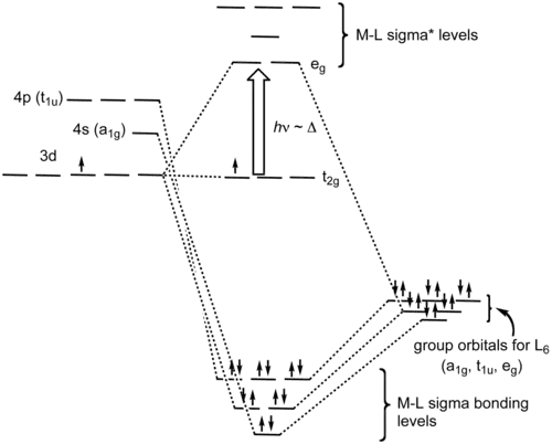 Dans un complexe octaédrique, les orbitales moléculaires créées par coordination peuvent être vues comme résultant de la cession, par chacun des six ligands donneurs σ, de deux électrons aux orbitales d du métal de transition. Il se forme des orbitales liantes et antiliantes dz2 et dx2−y2 tandis que les orbitales dxy, dxz et dyz demeurent non liantes — mais disponibles pour établir des liaisons π. Des interactions liantes et antiliantes s'établissent également avec les orbitales s et p, ce qui fait un total de six orbitales liantes et six orbitales antiliantes.