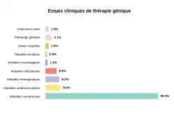 Le concept de thérapie génique est né de l'idée de traiter des pathologies héréditaires. Il s'est rapidement orienté vers le traitement de toutes les affections, héréditaires ou non, dans lesquelles il était possible d'imaginer que certains gènes étaient défectueux ou qu'il était possible d'envisager un rôle pour de nouveaux gènes. Les cancers, les infections virales, la douleur, les affections cardiaques, les atteintes traumatiques du système nerveux… Conceptuellement, il n'est pas une pathologie qui ne pourrait pas bénéficier d'une approche de thérapie génique, que ce soit par une stratégie de restauration d'une activité génétique défaillante ou par la production d'une activité supplémentaire qui puisse avoir un impact thérapeutique. En 2013, près de 2 000 essais cliniques auraient été proposés au niveau international[réf. nécessaire],[23]. L'analyse cumulée des données montre que, depuis le premier essai clinique (qui s'intéressait alors au traitement du cancer), environ 65 % des essais se focalisent sur le traitement du cancer, et 35% sur des pathologies très variables comme les infections virales, les maladies neurologiques, les pathologies oculaires, les maladies liées à des déficiences au niveau du système sanguin... Si le jeu des statistiques est tentant, il faut toutefois se garder de tirer des conclusions claires de l'analyse globale de ces protocoles qui s'intéressent à des pathologies, des technologies et des concepts très diversifiés. De plus, le peu de données exhaustives qu'il est possible d'obtenir pour ces protocoles rend difficile l'estimation du nombre réel de protocoles cliniques effectivement réalisés, du nombre de patients, du niveau de divulgation des résultats du protocole dans des journaux scientifiques, voire du réel intérêt thérapeutique des protocoles réalisés.