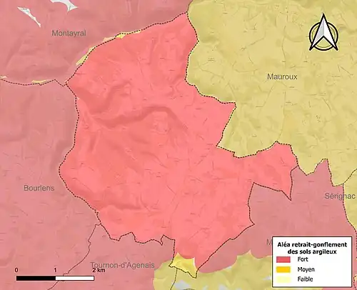 Le retrait-gonflement des sols argileux est susceptible d'engendrer des dommages importants aux bâtiments en cas d’alternance de périodes de sécheresse et de pluie[17]. La totalité de la commune est en aléa moyen ou fort (91,8 % au niveau départemental et 48,5 % au niveau national)[Carte 2]. Depuis le , en application de la loi ELAN, différentes contraintes s'imposent aux vendeurs, maîtres d'ouvrages ou constructeurs de biens situés dans une zone classée en aléa moyen ou fort[Note 1],[18].