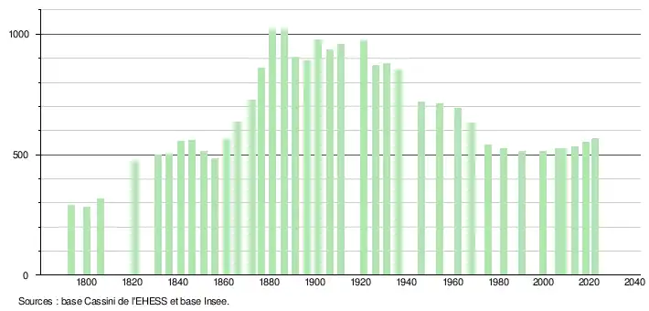 L'évolution du nombre d'habitants est connue à travers les recensements de la population effectués dans la commune depuis 1793. Pour les communes de moins de 10 000 habitants, une enquête de recensement portant sur toute la population est réalisée tous les cinq ans, les populations de référence des années intermédiaires étant quant à elles estimées par interpolation ou extrapolation[30]. Pour la commune, le premier recensement exhaustif entrant dans le cadre du nouveau dispositif a été réalisé en 2008[31].