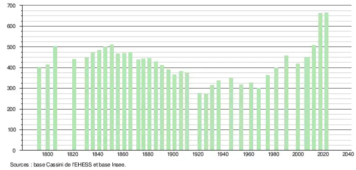 L'évolution du nombre d'habitants est connue à travers les recensements de la population effectués dans la commune depuis 1793. Pour les communes de moins de 10 000 habitants, une enquête de recensement portant sur toute la population est réalisée tous les cinq ans, les populations de référence des années intermédiaires étant quant à elles estimées par interpolation ou extrapolation[32]. Pour la commune, le premier recensement exhaustif entrant dans le cadre du nouveau dispositif a été réalisé en 2007[33].