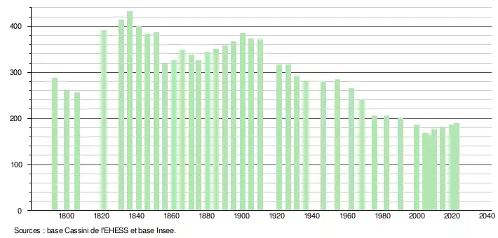 L'évolution du nombre d'habitants est connue à travers les recensements de la population effectués dans la commune depuis 1793. Pour les communes de moins de 10 000 habitants, une enquête de recensement portant sur toute la population est réalisée tous les cinq ans, les populations de référence des années intermédiaires étant quant à elles estimées par interpolation ou extrapolation[20]. Pour la commune, le premier recensement exhaustif entrant dans le cadre du nouveau dispositif a été réalisé en 2004[21].