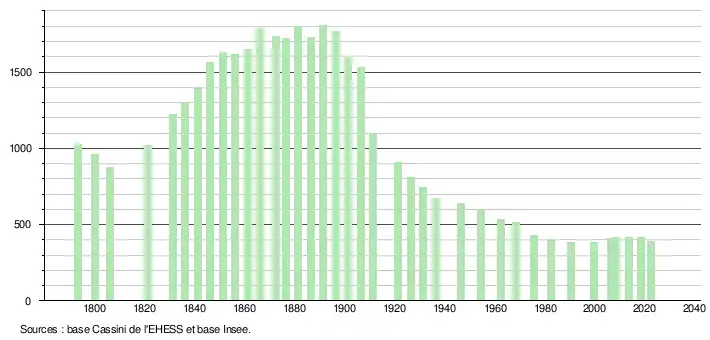L'évolution du nombre d'habitants est connue à travers les recensements de la population effectués dans la commune depuis 1793. Pour les communes de moins de 10 000 habitants, une enquête de recensement portant sur toute la population est réalisée tous les cinq ans, les populations de référence des années intermédiaires étant quant à elles estimées par interpolation ou extrapolation[21]. Pour la commune, le premier recensement exhaustif entrant dans le cadre du nouveau dispositif a été réalisé en 2008[22].