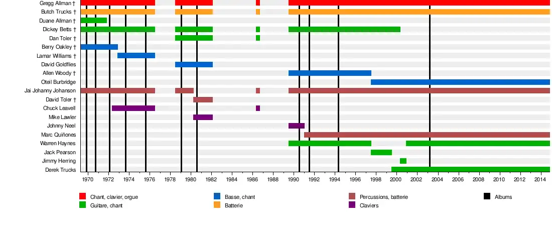 Gregg Allman (†) Jai Johanny Johanson Duane Allman (†) Berry Oakley (†) Dickey Betts (†) Lamar Williams (†) Chuck Leavell David Goldflies Dan Toler (†) Frankie Toler (†) Mike Lawler Johnny Neel Allen Woody (†) Jack Pearson Butch Trucks (†) Jai Johanny « Jaimoe » Johanson Marc Quinones Oteil Burbridge Derek Trucks Warren Haynes |