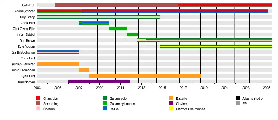 - Ahren Stringer – chant (2003-2025), basse (2007-2025), guitare rythmique (2003–2007)
