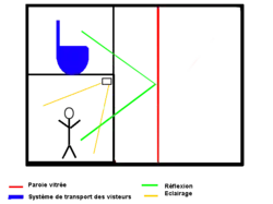 Une salle vide est montrée au public depuis un espace surélevé. Une vitre placée verticalement sépare la salle en deux, et offre une surface de réflexion. Une partie de la salle est décorée avec les accessoires désirés. Sous les visiteurs, une salle contient des personnages disposés comme s'ils étaient dans la salle, mais de façon symétrique. Ici, ce sont des audio-animatronics éclairés par intermittence pour simuler leurs apparitions-disparitions. L'image des personnages est réfléchie sur la paroi vitrée.