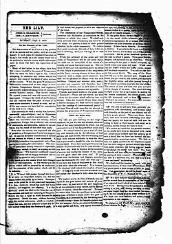 En 1850, The Lily se décrit comme « dévoué aux intérêts des femmes »[Note 4] ; en 1852, le journal affirme se consacrer à « l'émancipation de la femme vis-à-vis de l'intempérance, l'injustice, les préjugés et le sectarisme »[Note 5],[1].