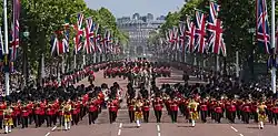La circulation automobile est aussi interdite dans The Mall durant la cérémonie de Trooping the Colour, quand tous les régiments d'infanterie et cavalerie de la Garde de la Maison du souverain (Household Division ou division de la Maison royale) défilent le long de la rue, allant ou partant de la Horse Guards Parade, accompagnés par la famille royale britannique, qui, elle, se déplace en voiture à cheval. À la fin de la cérémonie, les Red Arrows et d'autres avions de la Royal Air Force survolent l'avenue.
