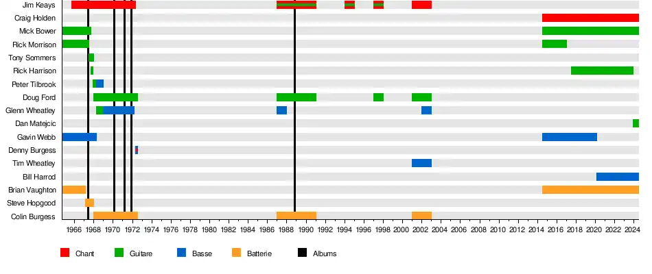 - Jim Keays (en) : chant, harmonica (1965-1971, 1987-1991, 1994-1995, 1997, 2001-2002)