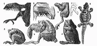 Il poursuit en affirmant que d'autres caractéristiques d’Archaeopteryx ressemblent remarquablement à celles d'un oiseau et n'ont que peu de ressemblance avec leurs analogues reptiliens. La main d’Archaeopteryx est considérée comme l'une de ses caractéristiques les plus remarquables, avec ce que Heilmann appelle une « base reptilienne » qui en est venue à supporter les plumes primaires. Il compare cette main à celle d'un reptile primitif à cinq doigts, notant les différences évidentes, avant de souligner la similitude frappante de la main avec celle du théropode Ornitholestes[13]. Heilmann entre ici dans les détails de la disposition des ailes d’Archaeopteryx, en s'appuyant sur son observation du spécimen de Berlin[14]. La dernière partie de cette section traite de l'analyse de l'anatomie du squelette des oiseaux fossiles Hesperornis et Ichthyornis, mais Heilmann décide finalement qu'ils n'ont pas d'importance pour ses recherches[15]. Il conclut la section en déclarant qu’Archéoptéryx « peut être caractérisé comme un reptile déguisé en oiseau », et déclare que ses études doivent passer du squelette aux tissus mous pour parvenir à une conclusion finale[16].