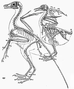 Il commence la section par une analyse de l'ouverture temporale que l'on trouve dans le crâne de nombreux oiseaux existants. Après une comparaison approfondie, il rejette l'idée, courante à l'époque, que cette ouverture temporale est homologue à la fenestra supratemporale des reptiles. Il conclut plutôt qu'il s'agit d'une caractéristique récente[21]. Il fait ensuite quelques observations sur la structure de l'aile des oiseaux nicheurs modernes. Il constate que certaines espèces d'oiseaux existants ont des griffes sur leurs premier et deuxième doigts lorsqu'ils sont très jeunes, et que certaines, comme l'hoatzin, utilisent même ces griffes temporaires pour grimper, y compris dans les branches des arbres. Il découvre également que beaucoup plus d'oisillons ont une griffe non fonctionnelle sur le premier doigt, et que certains oiseaux adultes en ont également une[22].