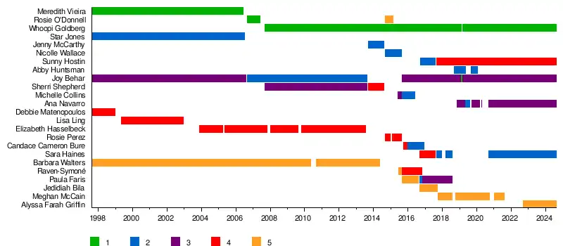 - Rosie O'Donnell, initialement modératrice en 2006-2007, est revenue sur le siège 5 en 2014-2015 (le troisième siège était alors vacant).