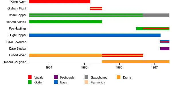 - Robert Wyatt : batterie, chant - Batteur de Soft Machine des débuts en 1966 jusqu'à son départ après l'album Fourth en 1971. A alors formé son propre groupe Matching Mole de 1971 à 1973 et a produit 2 albums sous ce nom. A entamé une carrière solo, avec un premier album The End of an Ear sorti en 1970, puis le fameux Rock Bottom produit par Nick Mason des Pink Floyd. Son dernier album en date, Different Every Time remonte à 2014. Il a aussi joué occasionnellement avec son ami David Gilmour sur ses albums solo et en concerts.