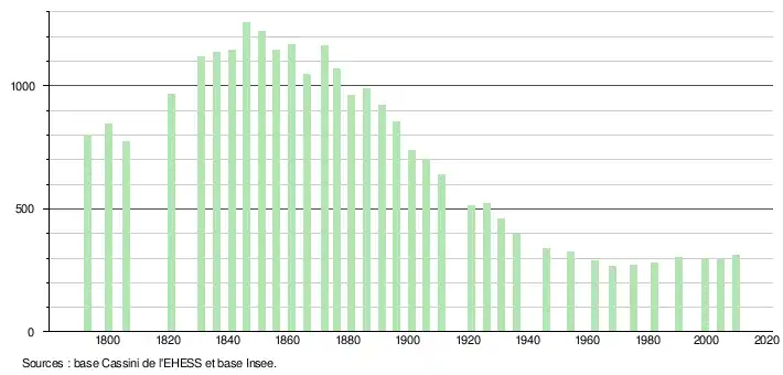 L'évolution du nombre d'habitants est connue à travers les recensements de la population effectués dans la commune depuis 1793. À partir du , les populations légales des communes sont publiées annuellement dans le cadre d'un recensement qui repose désormais sur une collecte d'information annuelle, concernant successivement tous les territoires communaux au cours d'une période de cinq ans. Pour les communes de moins de 10 000 habitants, une enquête de recensement portant sur toute la population est réalisée tous les cinq ans, les populations légales des années intermédiaires étant quant à elles estimées par interpolation ou extrapolation[4]. Pour la commune, le premier recensement exhaustif entrant dans le cadre du nouveau dispositif a été réalisé en 2004[5],[Note 1].