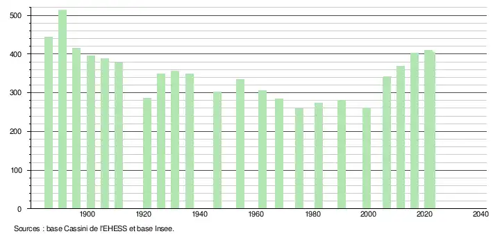 L'évolution du nombre d'habitants est connue à travers les recensements de la population effectués dans la commune depuis 1886. Pour les communes de moins de 10 000 habitants, une enquête de recensement portant sur toute la population est réalisée tous les cinq ans, les populations de référence des années intermédiaires étant quant à elles estimées par interpolation ou extrapolation[26]. Pour la commune, le premier recensement exhaustif entrant dans le cadre du nouveau dispositif a été réalisé en 2006[27].